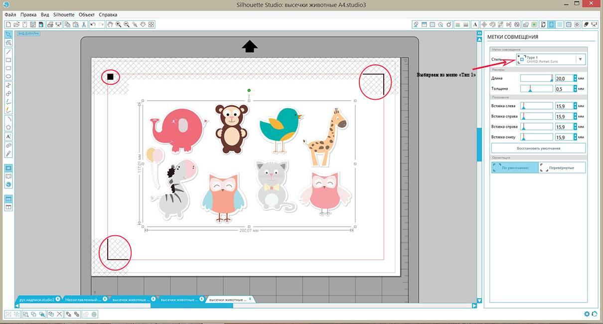 Заходим в настройки меток совмещения и в строке «стиль» выбираем «Type 1» . На листе появляются метки: 1 черный квадратик в верхнем левом углу, две галочки в верхнем правом углу и в нижнем левом углу, а также заштрихованная сетка. За эти метки ваш рисунок и границы его резки не должны заходить.