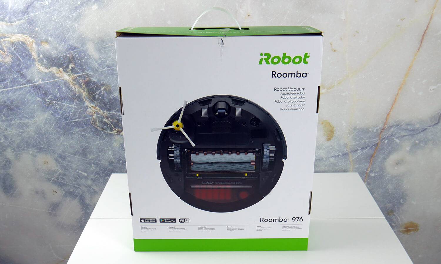 На одной стороне коробки логотип iRobot, фотография самого пылесоса и название модели – Roomba 976. На обратной стороне видим нижнюю часть робота, со щетками валиками сбора пыли. Открыв коробку сразу видим пылесос, кстати, он обошелся в 29 800 рублей.