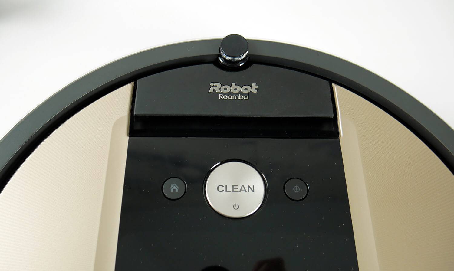 В верхней части лицевой панели разместился логотип компании iRobot, рядом с ним выступает на полсантиметра датчик обнаружения док-станции. Незаметная ручка для переноски находится под названием бренда. На фронтальной поверхности три кнопки: