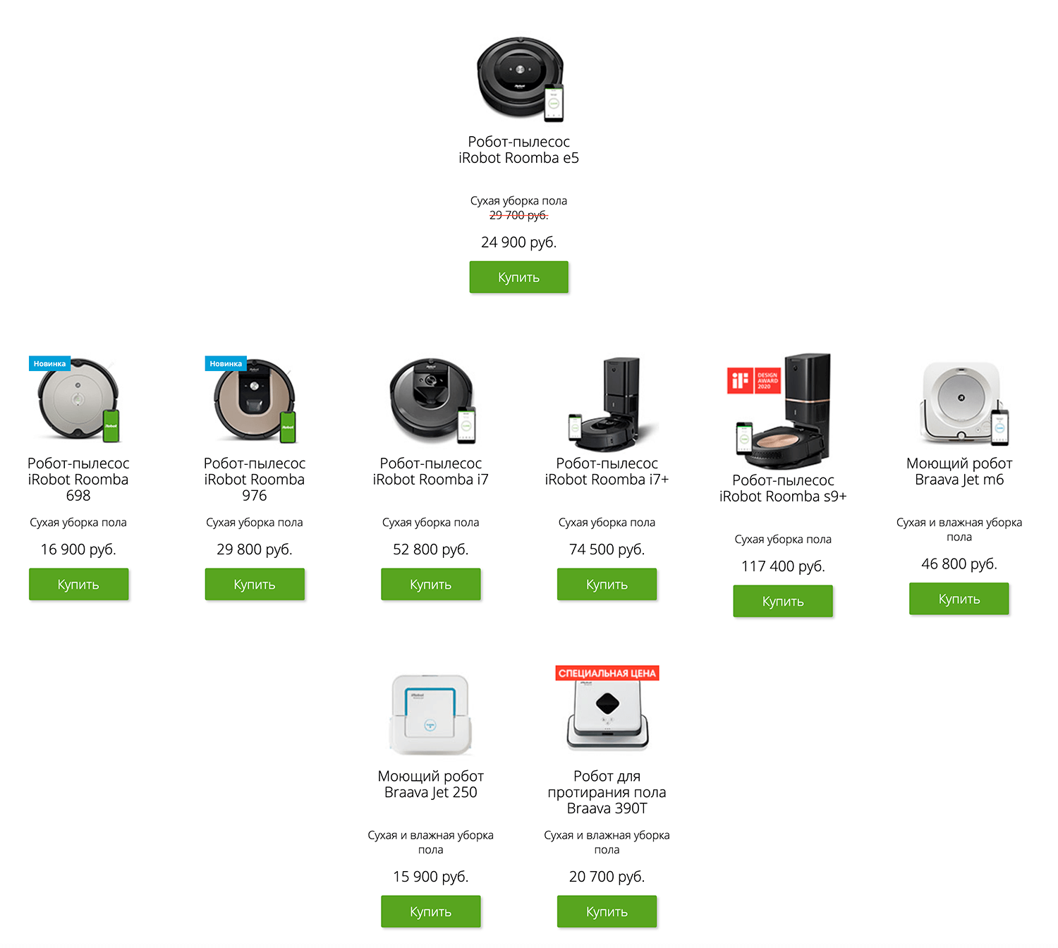 Как можем заметить, всю прошлую 900-серию вывели из продажи и с официального сайта она также пропала. Это были модели 960 и 980. Теперь только iRobot Roomba 976 и она числится как новинка.