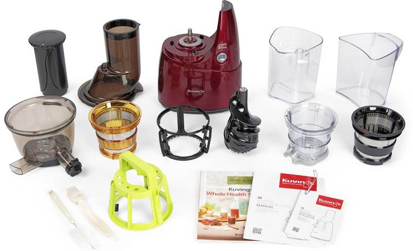 В комплекте много насадок, благодаря которым можно делать не только сок, а также пюре, лапшу, сорбет, ореховую пасту. Модель справляется с грушами, свеклой, морковью, гранатом, сельдереем, салатом, петрушкой, укропом. Жмых отделяется автоматически и измельчается специальной насадкой на выходе. Отжимная корзина из прозрачного пластика позволяет рассмотреть консистенцию плодов в ней. Уровень шума ниже, чем у многих аналогов.