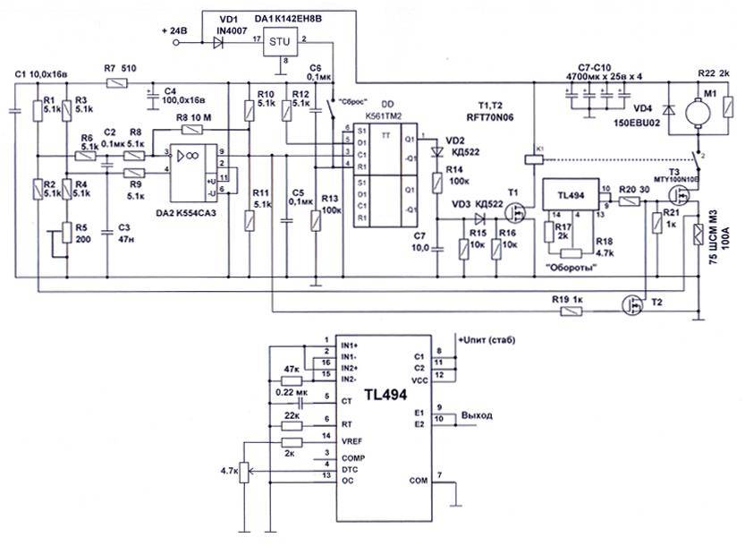 - Реверсивный регулятор числа оборотов. Схема регулировки собрана на ШИМ-контроллере и полевовом транзисторе. Реверс осуществляется переключением полярности подключения питания к щёткам двигателя;