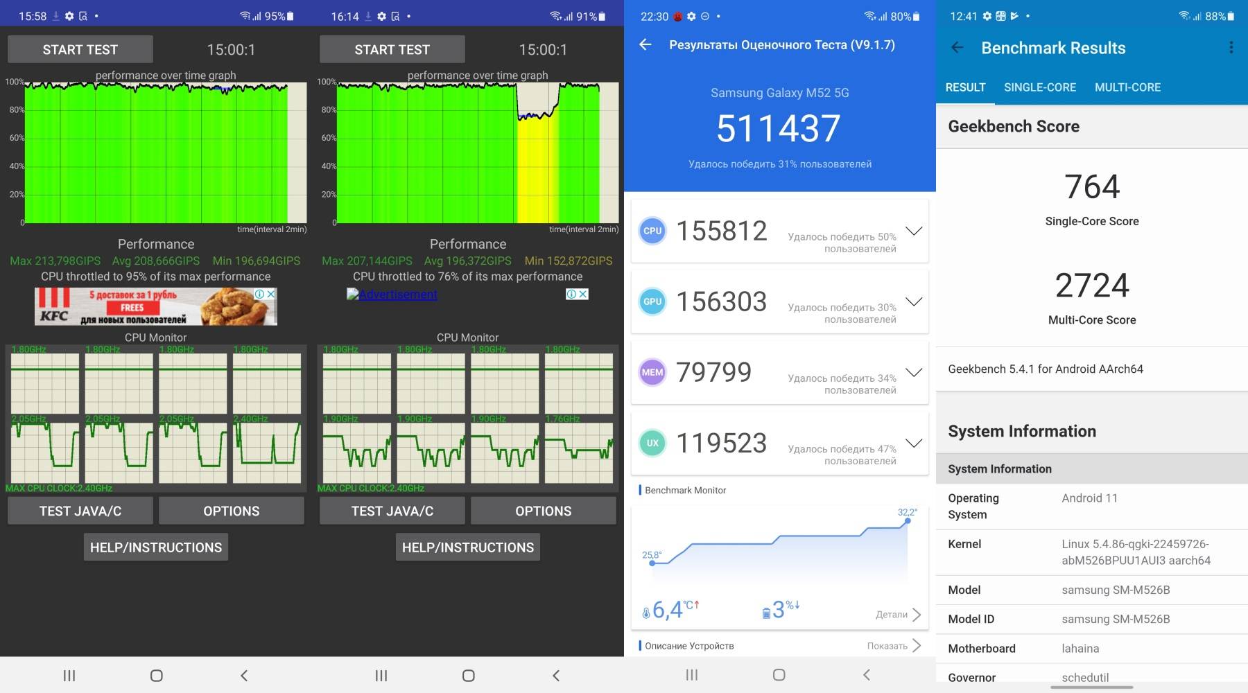 В России смартфон продаётся в единственной версии: 6 ГБ оперативной и 128 ГБ встроенной памяти, плюс можно поставить microSD при необходимости. Тесты на троттлинг Galaxy M52 5G проходит успешно, результаты стабильные, с играми тоже дела обстоят нормально. Для требовательных шутеров вроде PUBG с максимальными настройками графики мощности маловато, но если играть на средних, то останетесь довольны — игры идут плавно, корпус не перегревается под нагрузкой.