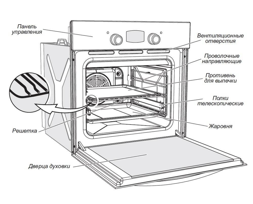 Устройство духового шкафаНа заметку! Модели со встроенным вентилятором обеспечивают наиболее равномерное распределение тепла, пропекая продукты со всех сторон. Хозяйке теперь не приходится переворачивать мясную тушку, опасаясь подгорания ее отдельных частей.