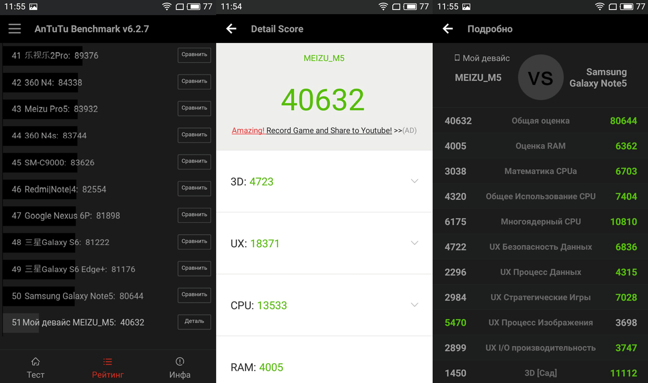 В повседневной работе смартфон радует. Благодаря отличной оптимизации фирменной оболочки Flyme, он работает безукоризненно шустро, без каких-либо подлагиваний и задержек. 3 ГБ ОЗУ с головой хватает для серфинга интернета с кучей открытых вкладок и запуска в фоне множества приложений, а встроенное хранилище можно расширить флешкой объемом до 128 ГБ либо USB-накопителем (М5 поддерживает технологию USB-OTG).