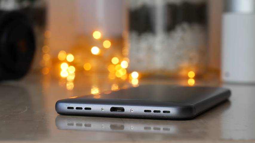 На верхней грани ничего нет, на нижней расположены перфорации основного динамика, разъем microUSB для зарядки, разъем 3,5-мм для наушников и небольшое отверстие микрофона шумоподавления.