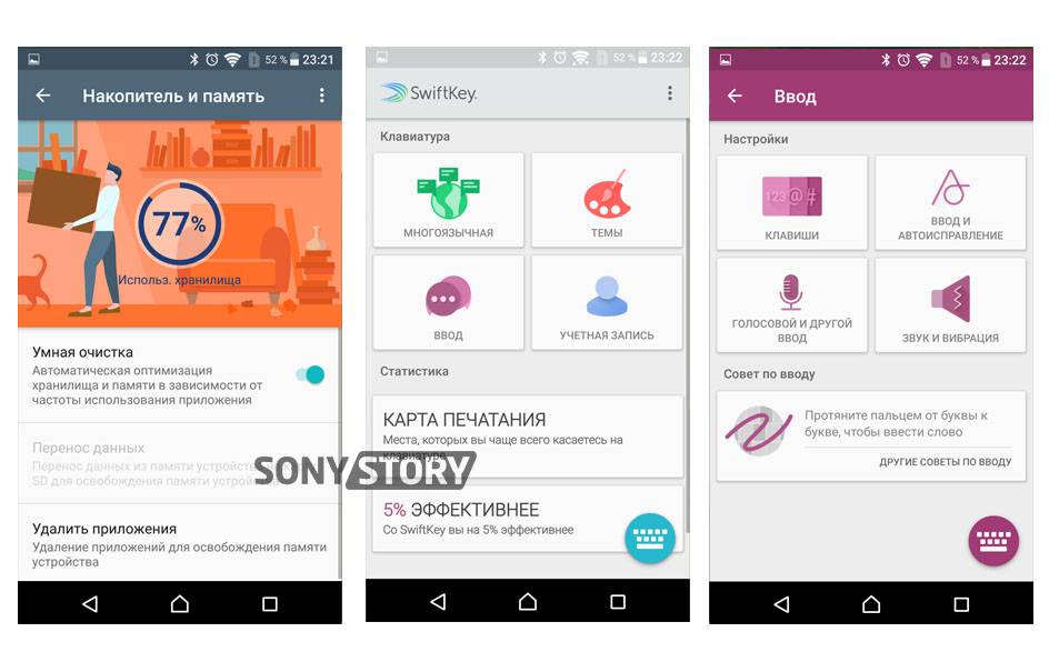 Присутствуют Умная очистка (встроенный в систему аналог Clean Master), клавиатура SwiftKey и другие программные фишки, присущие Xperia X (смотреть обзор).