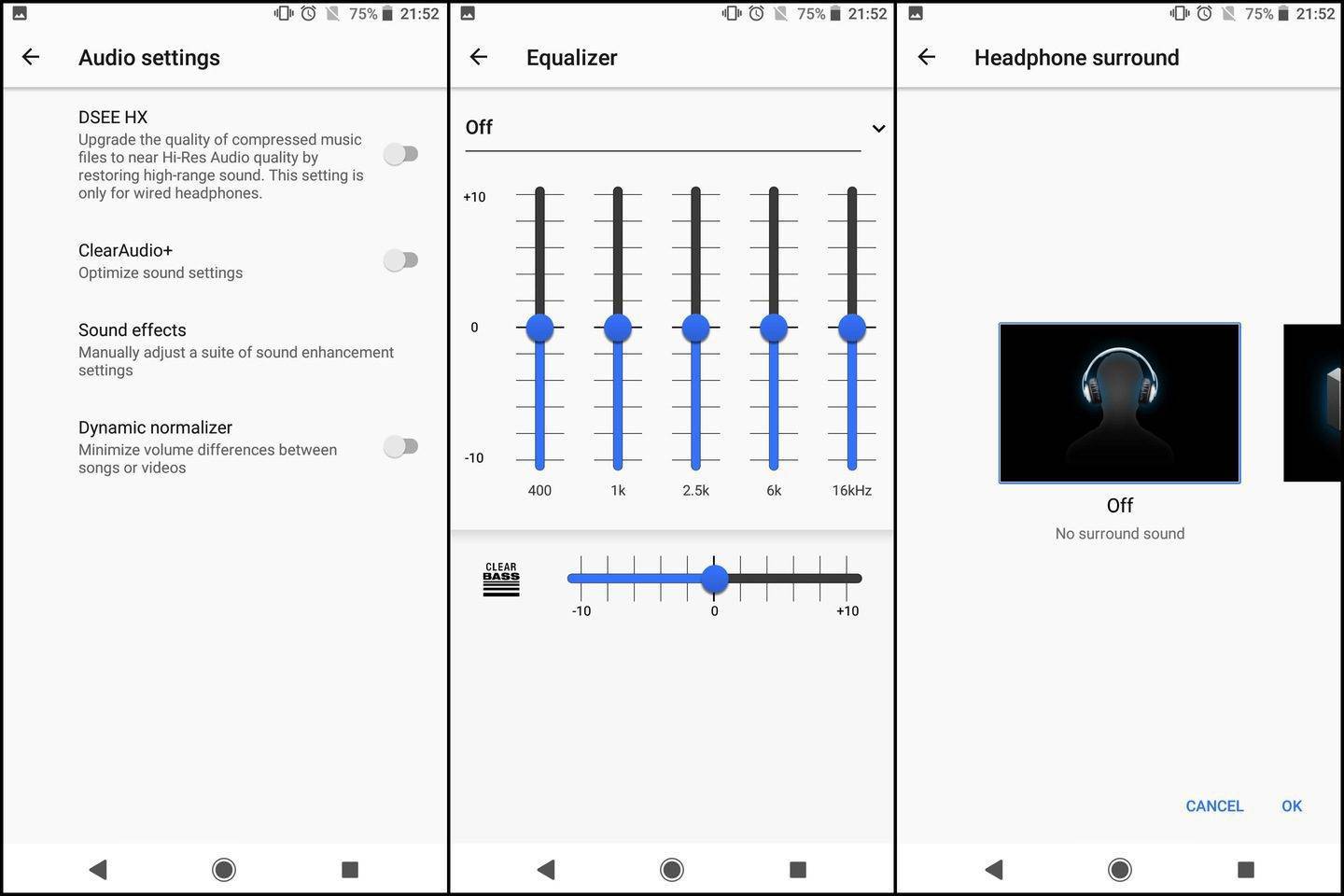 На борту у XA2 Plus есть горстка классических аудиоулучшайзеров Sony. Алгоритм DSEE HX пытается достраивать MP3 до хайрезов, но работает только с проводным подключением. Функция ClearAudio+ выпячивает среднечастотный диапазон и призвана за счет этого «оптимизировать звучание». Есть еще эквалайзер и режим эмуляции объемного звука в различных средах.