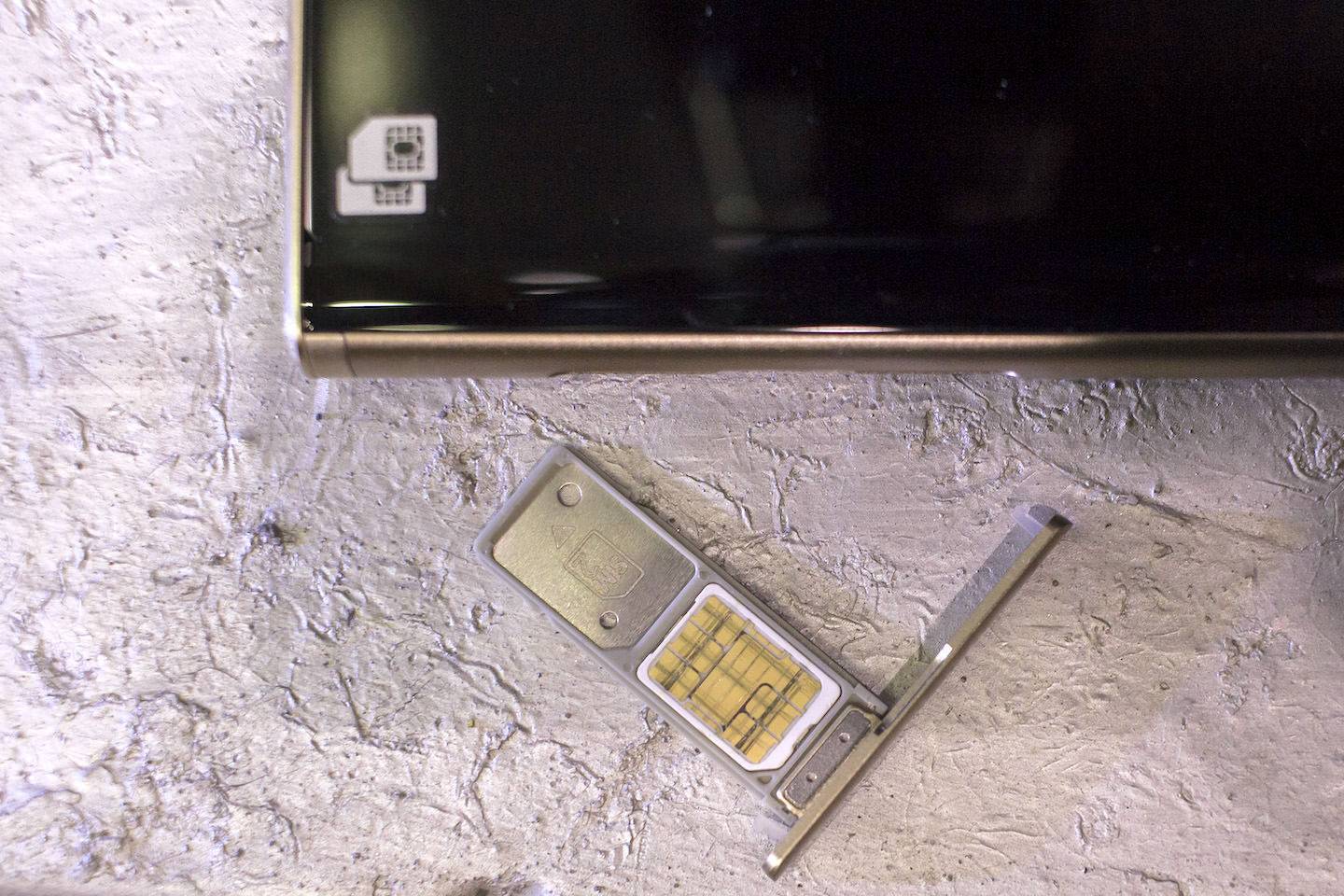 На левом ребре находится слот, закрытый крышкой, которую легко поддеть ногтем. На крышке закреплен лоток, предназначенный для первого модуля идентификации абонента (формата nanoSIM). Другой, не связанный с крышкой лоток (опять же, извлекаемый, например, с помощью ногтя), рассчитан на установку второй nanoSIM или карты памяти microSD.