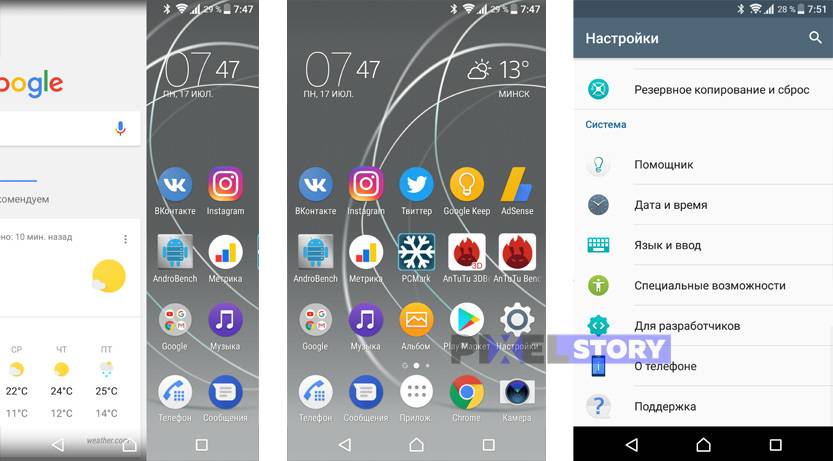 На тестовом аппарате установлен Android 7.1.1 c практически стоковым интерфейсом, который дополняют лишь некоторые надстройки от Sony. Это предустановленные фирменные приложения для новостей и работы с мультимедиа, а также поиск по системе, который можно вызвать свайпом вниз по рабочему столу.