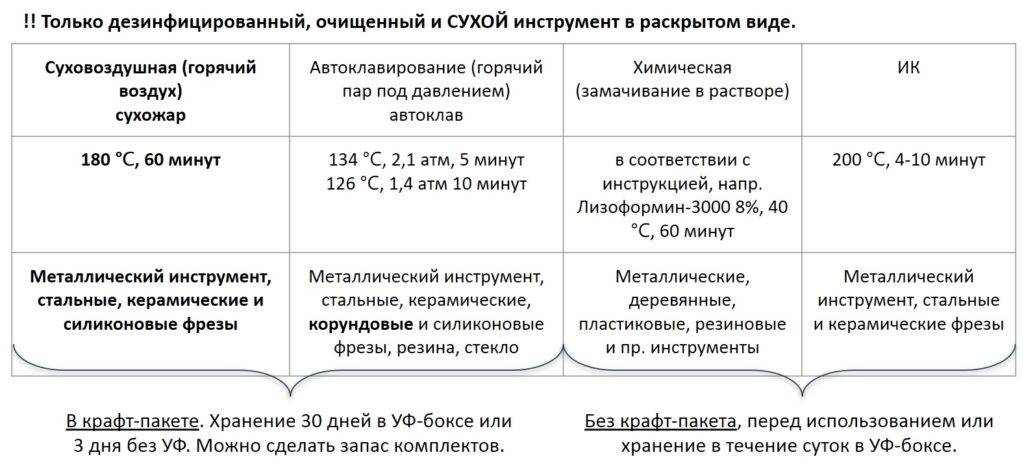 Ниже представлена таблица, в которой отражены наиболее популярные способы стерилизации маникюрного инструмента и, напрямую зависящие от выбранного способа, условия его хранения.