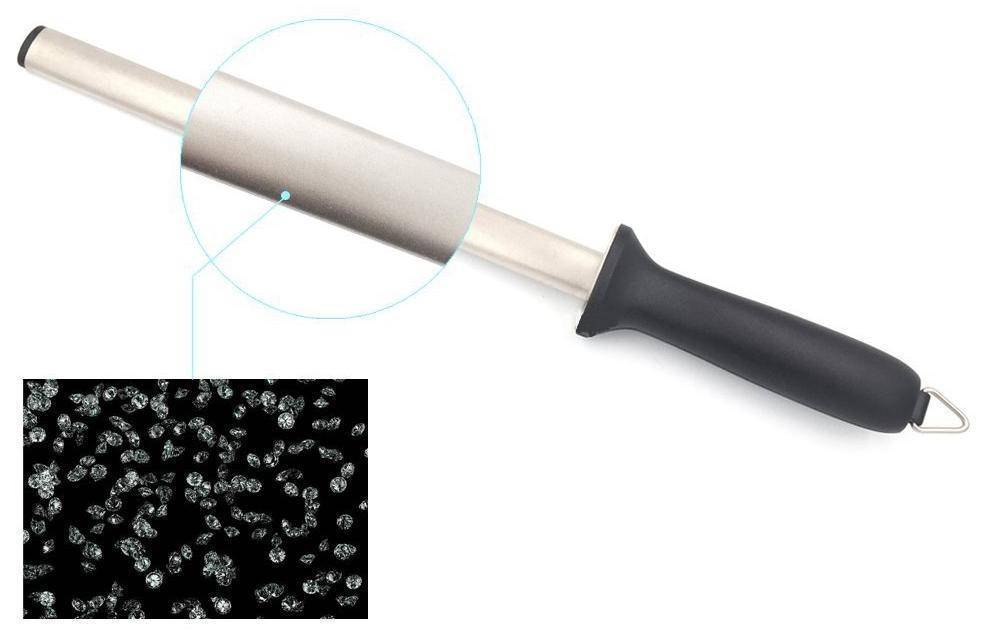 Мусат алмазный признан самым лучшим заточным инструментом, потому что достаточно сделать всего несколько движений – и даже самый твердый/большой нож станет снова острым. Инструмент с алмазным «стержнем» не используется для заточки лезвия, им можно лишь править и полировать металл.