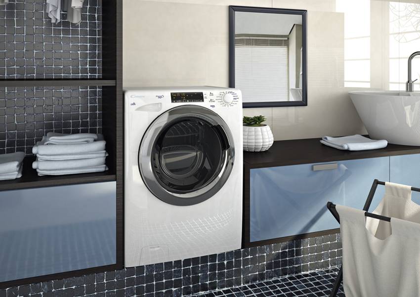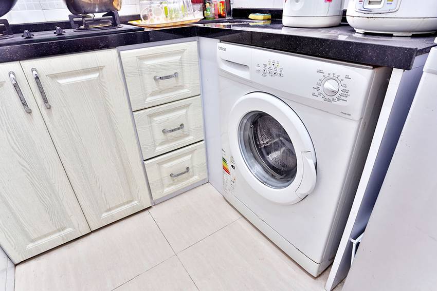 Модели с фронтальной загрузкой белья удобно размещать под раковиной