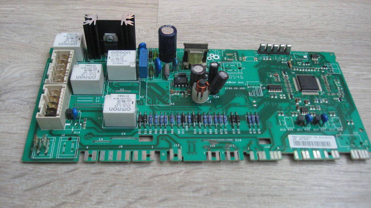 Электронное устройство руководит работой агрегата в соответствии с программой, контролирует уровень и температуру воды, время стирки и т. д.