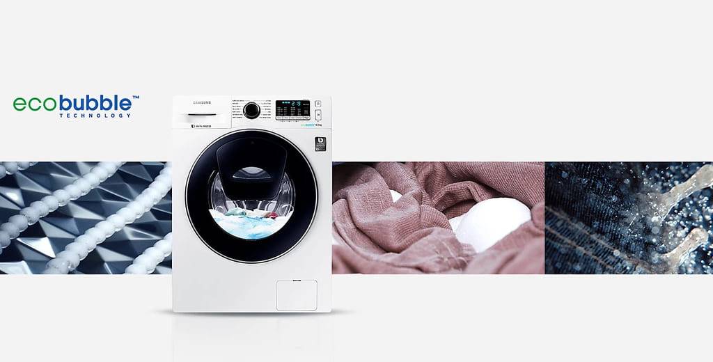 Сегодня многие производители используют самые экологичные технологии из всех возможных. Вот и Самсунг назвал свою Эко Бабл. Первое «Эко» — сокращение от слова экология, производитель словно намекает на полное отсутствие химии, либо чего-то вредного. Так оно и есть, функция относится к разряду механических особенностей, которые создают так называемые «Баблы», пузырьки воздуха, помогающие быстрее отстирывать даже самые загрязненные вещи. Еще с 2011 года появились модели, имеющие данную технологию, это касалось тех машинок, которые смещают 6 кг, 7 кг или даже 8 кг.