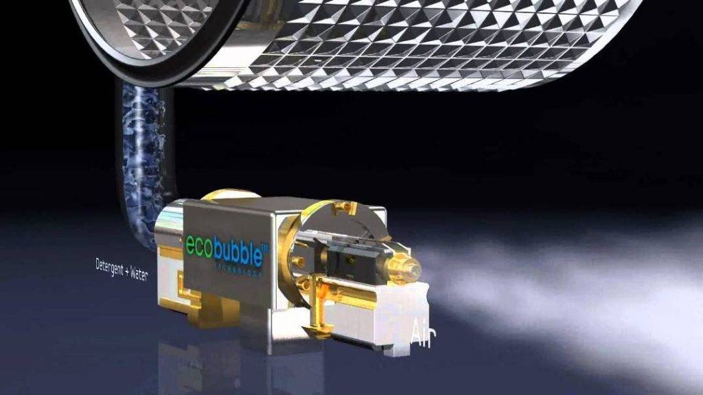 Устройство, вспенивающее смесь воды и порошка находится между патрубком диспенсера и баком стиральной машины. С технической точки зрения устройство Эко Бабл полезно тем, что оно экономит время, необходимое на растворение и вспенивание сухого порошка или моющего геля.