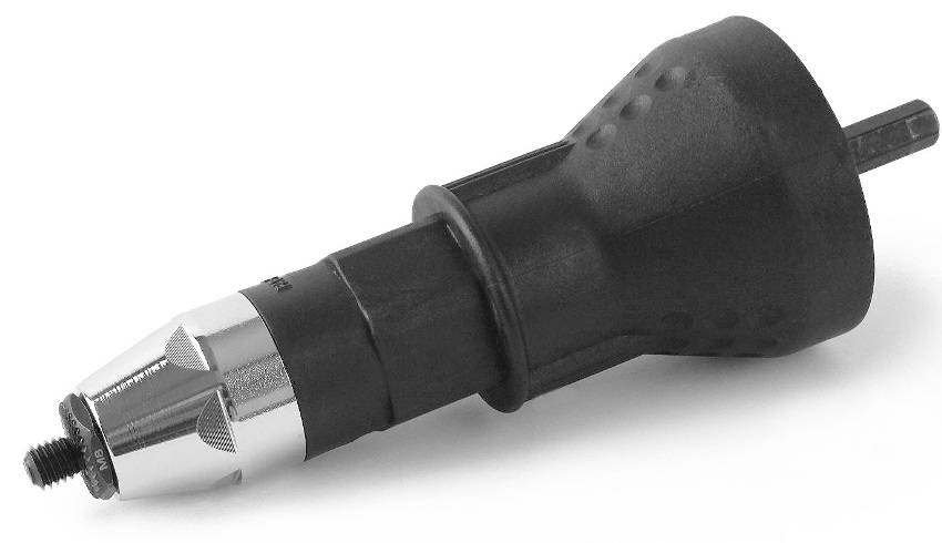 Такие приспособления можно использовать на электрическом и аккумуляторном инструменте для монтажа заклепок гаечного типа и других крепежных элементов, имеющих сердечник.