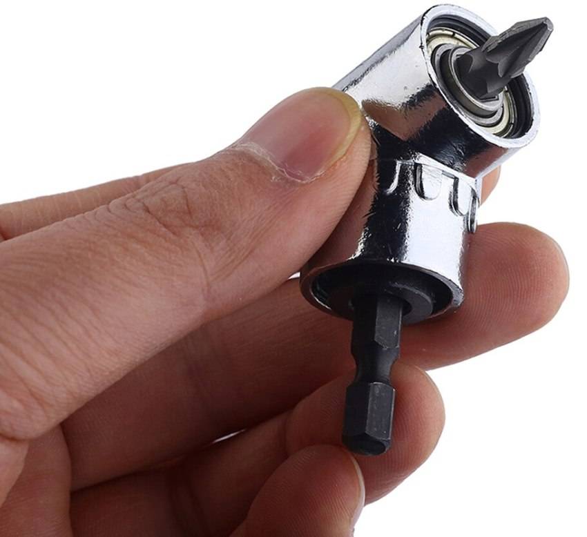Адаптеры с угловой конструкцией позволяют откручивать и закручивать крепеж в труднодоступных местах. Такие насадки значительно упрощают работу, ведь инструмент можно держать перпендикулярно по отношению к поверхности, а саморезы закручивать под углом, причем как слева, так и справа.