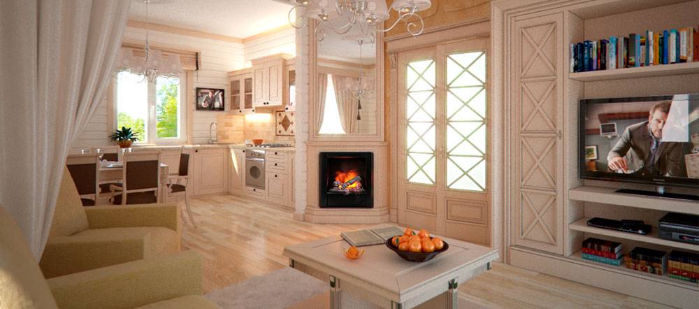 Внешний вид интерьера гостиной с камином