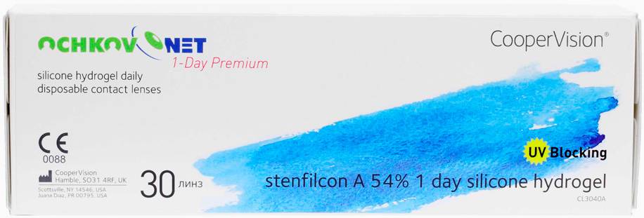 - 1-Day Premium (Ochkov.Net) — одноразовые силикон-гидрогелевые офтальмологические изделия, которые оснащены UV-фильтрами и имеют асферическую заднюю поверхность.