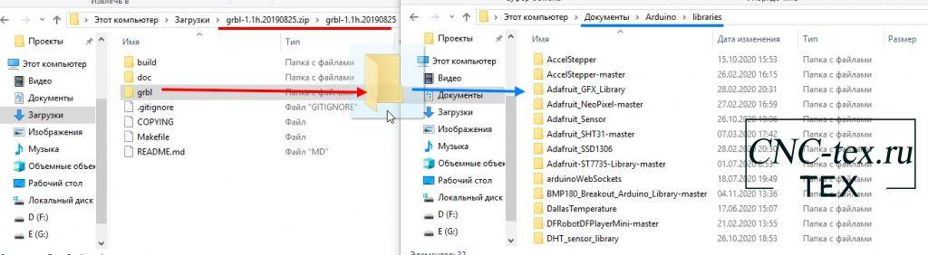 1) Скопировать папку GRBL, из архива, в папку с библиотеками Arduino, расположенную в: Документы\Arduino\libraries.