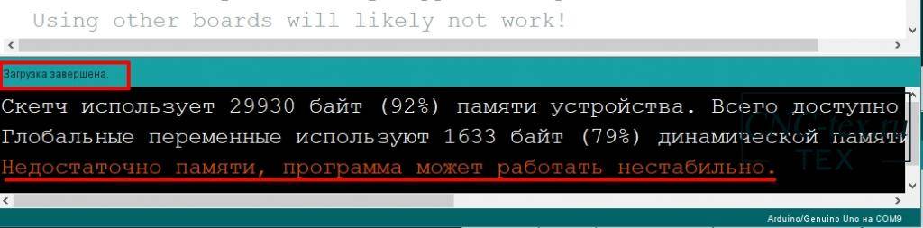 Чтобы это сделать нажимаем на кнопку «Загрузить». После компиляции скетча, код будет загружен в микроконтроллер. Не пугаемся надписи «Недостаточно памяти, программа может работать нестабильно», всё будет работать исправно.