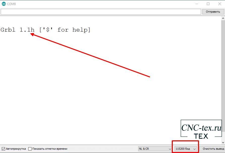 Для правильной работы обязательно выбираем скорость в 115200 бод. Если в мониторе порта вы увидите версию прошивки GRBL, это значит, что всё сделано правильно, а значит можно приступать к работе.