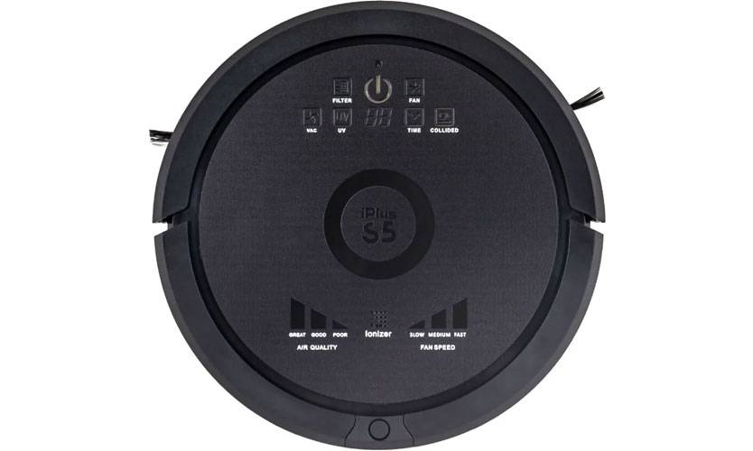 iPlus S5, как и многие приборы, имеет круглую форму. Габариты 30х30 см. Высота прибора небольшая (7 см), что позволяет ему беспрепятственно заезжать под не очень низкую мебель. Отличается современным лаконичным дизайном, что не противоречит ни одному типу интерьера. Выполнен из пластика черного цвета. Его вес составляет 4 кг.