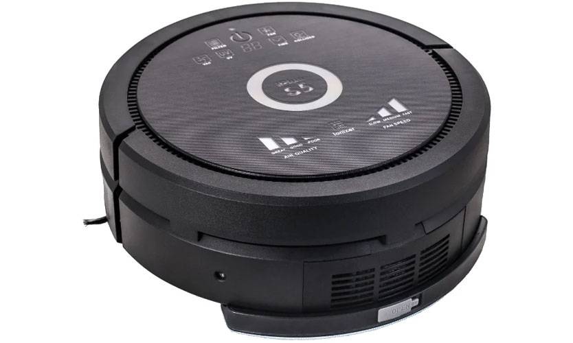 На верхней части установлена сенсорная панель управления с дисплеем, отображающим статус робота и текущее время. По всей окружности на боковой части расположены вентиляционные отверстия, через которые выходит очищенный воздух.