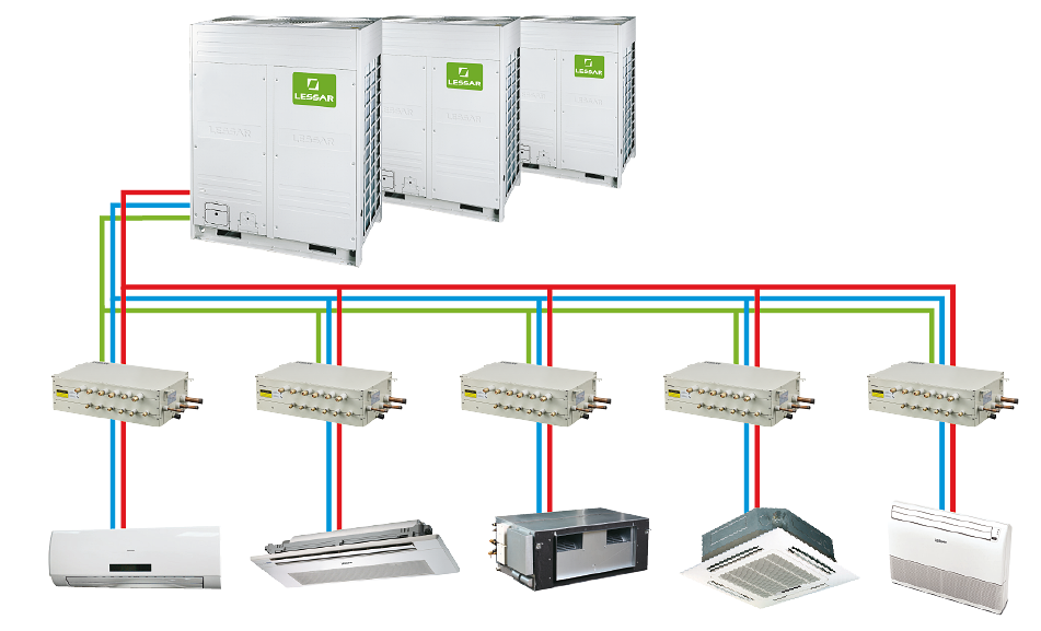Подобные системы предполагают использование трубопроводы общей фреоновой магистрали. Это может быть и трехтрубная система кондиционирования. Внутренние блоки оснащаются специальным теплорегулирующим вентилем. Его основное назначение заключается в контроле количества хладогена, которое поступает из трубопровода с учетом необходимой нагрузки. Именно поэтому данные системы отличаются такой точностью и эффективностью с точки зрения поддержания нужной температуры. В особенности если сравнивать их с классическими системами, в которых при регулировке могут возникнуть различные тепловые перепада, вызывая дискомфорт людей в помещении.