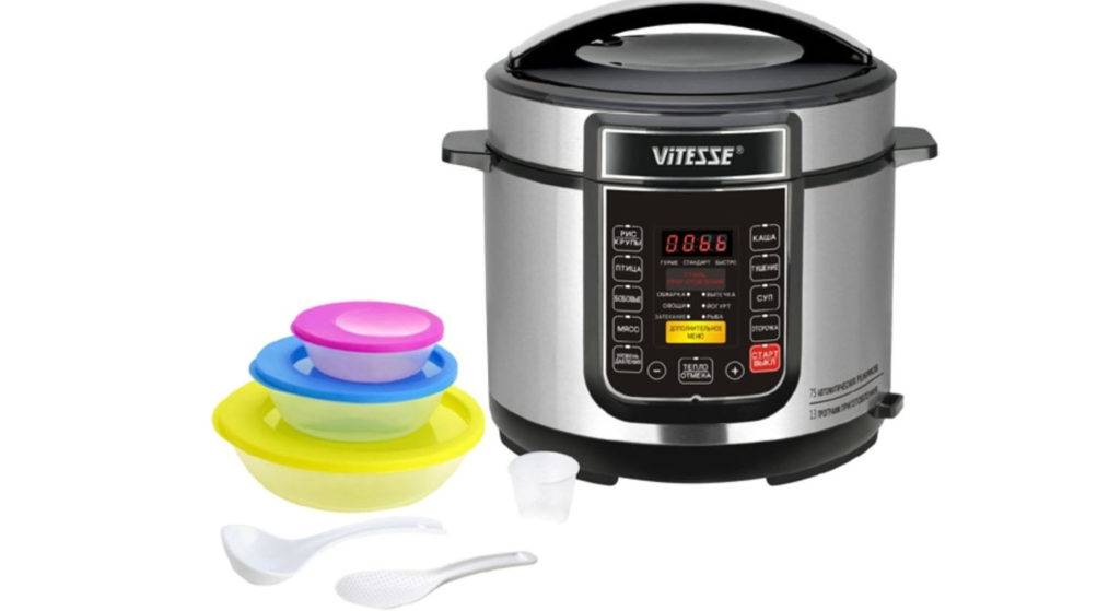 - Чаша 5 л, мощность 900 Вт, электронное управление с 8 режимами и 24 программами характеризует Vitesse VS-3003. О готовности блюда сообщит голосовой сигнал. Включение в комплект подробной книги рецептов, мерного стаканчика, лопатки, половника и нескольких пластиковых контейнеров добавило положительных отзывов о товаре. Среди отрицательных черт модели названы отсутствие пароварки и приготовления супов.
