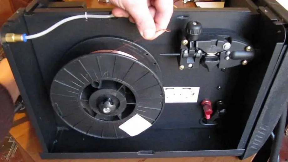 - Корпус аппарата. В нем размещаются основные элементы – источник электропитания постоянного тока (инверторный или простой выпрямитель), регуляторы тока, выходы, механизм подачи проволоки с катушки.
